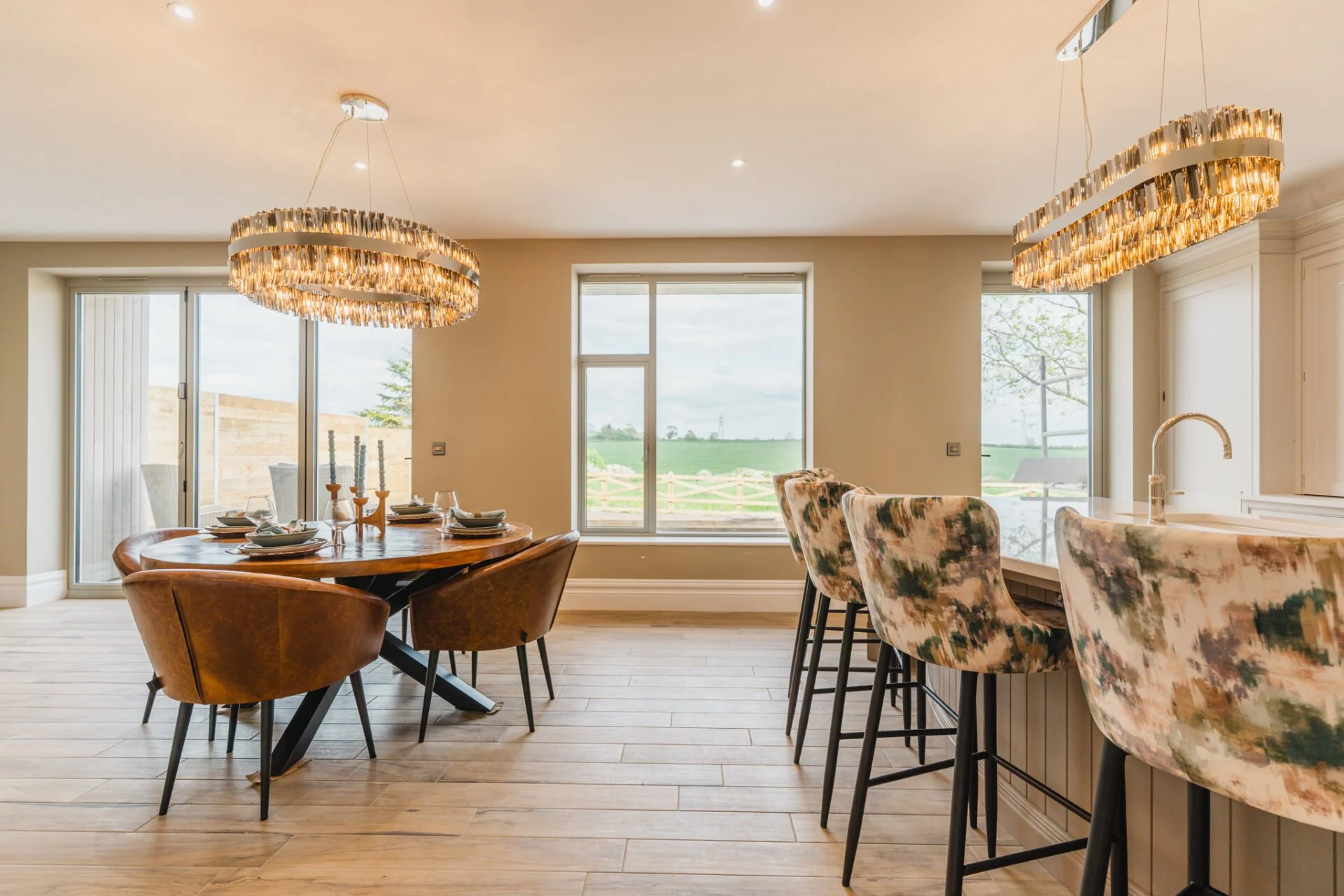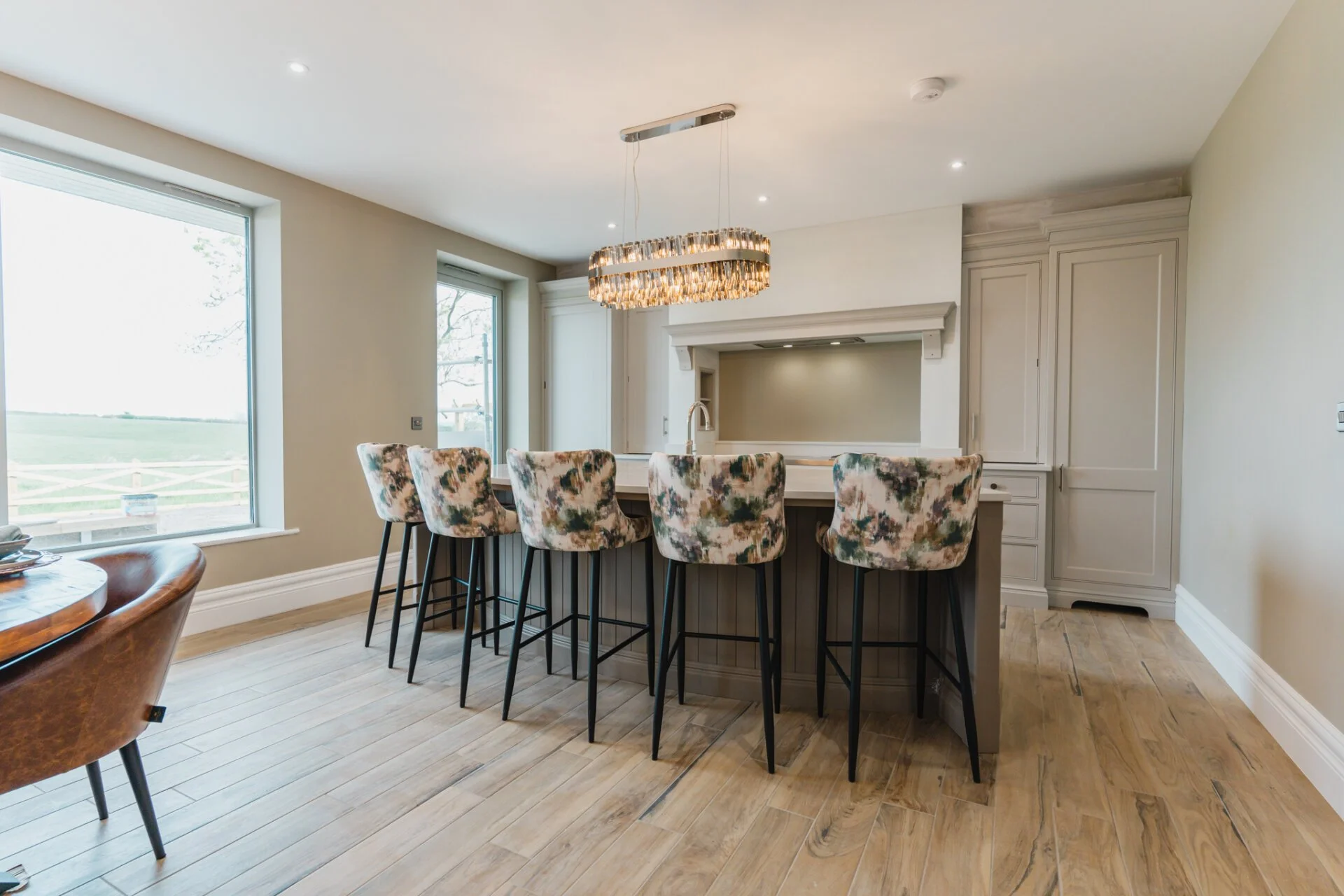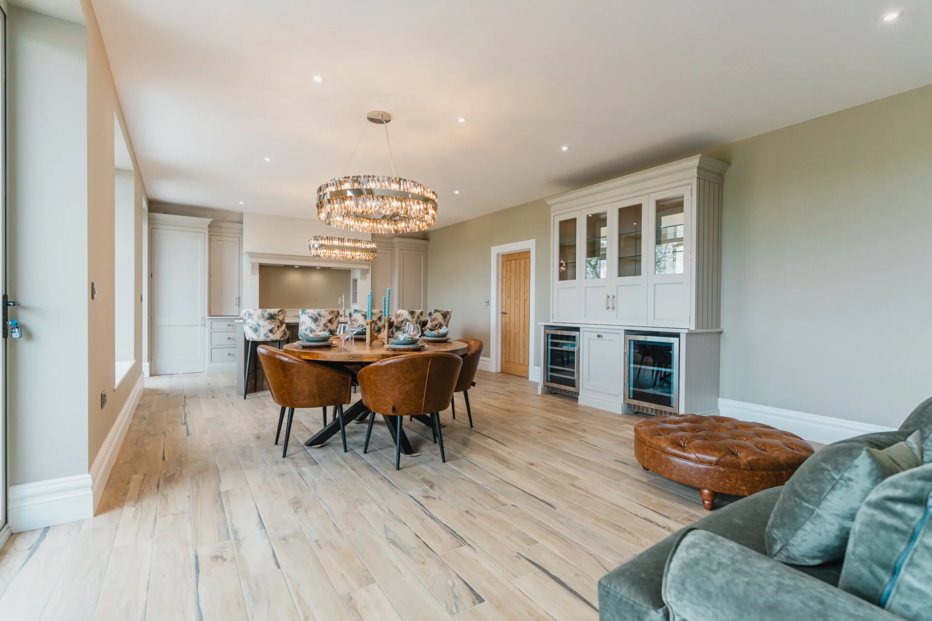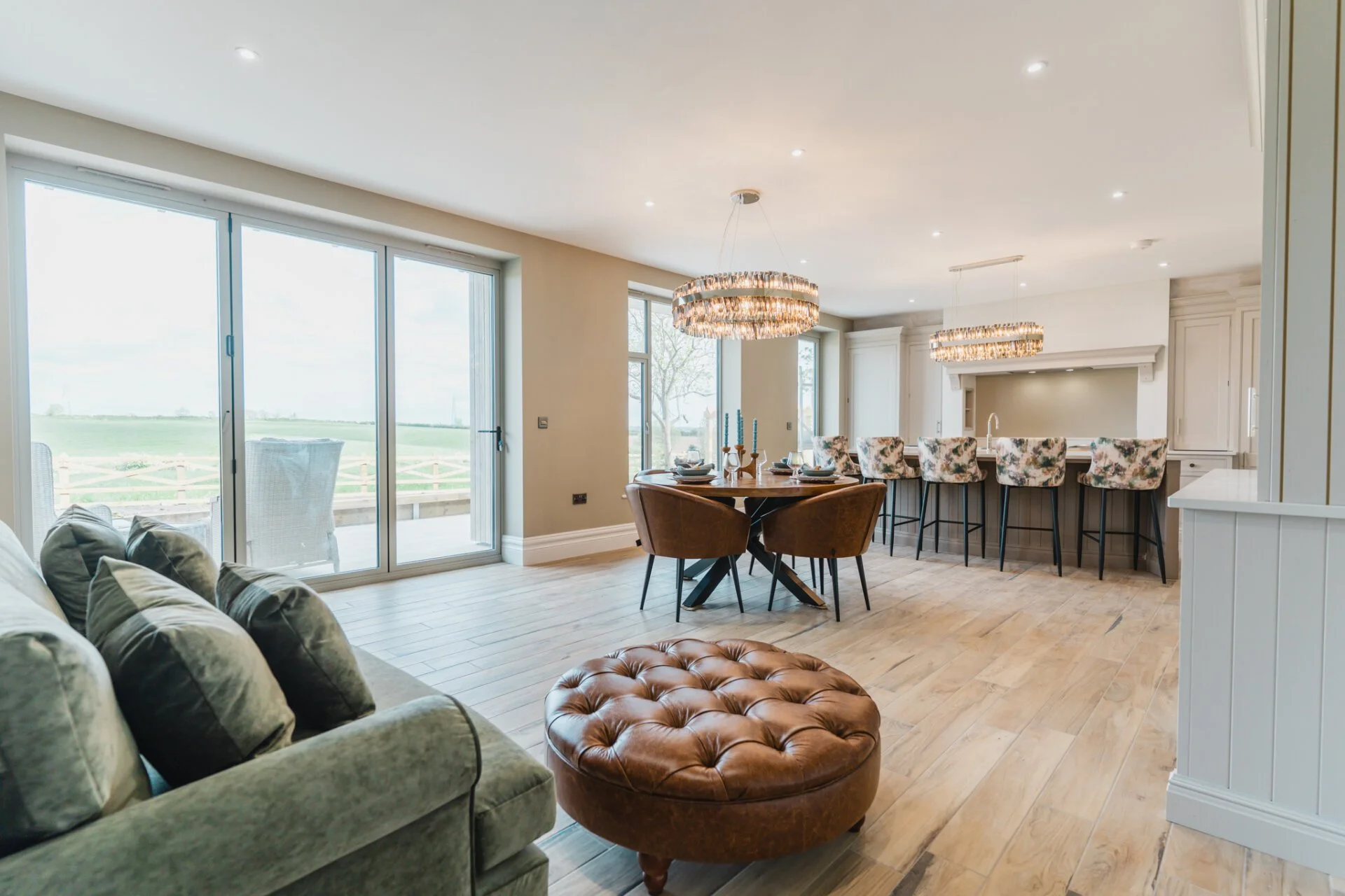Upon entering Mulberry House, guests are greeted by a stunning hand-made designer kitchen by Tom Howley, featuring exquisite quartz worktops, a central curved island with an inset sink and Quooker tap, a Bertazzoni Range cooker features as well as a separate pantry room, making it a chef's dream. This spacious open plan kitchen, living, and dining area boasts bi-folding doors that effortlessly connect the indoors with the outdoors, offering a seamless flow to the expansive rear garden with awe-inspiring countryside views.