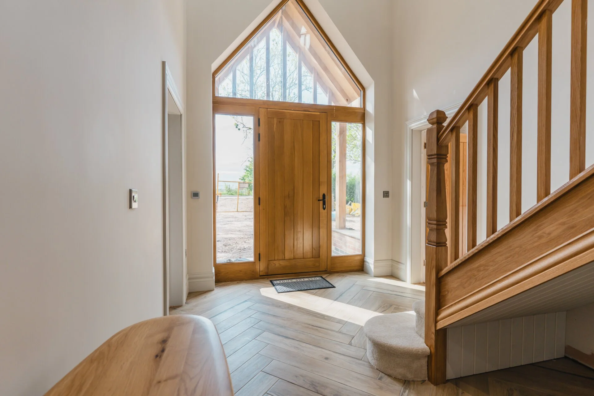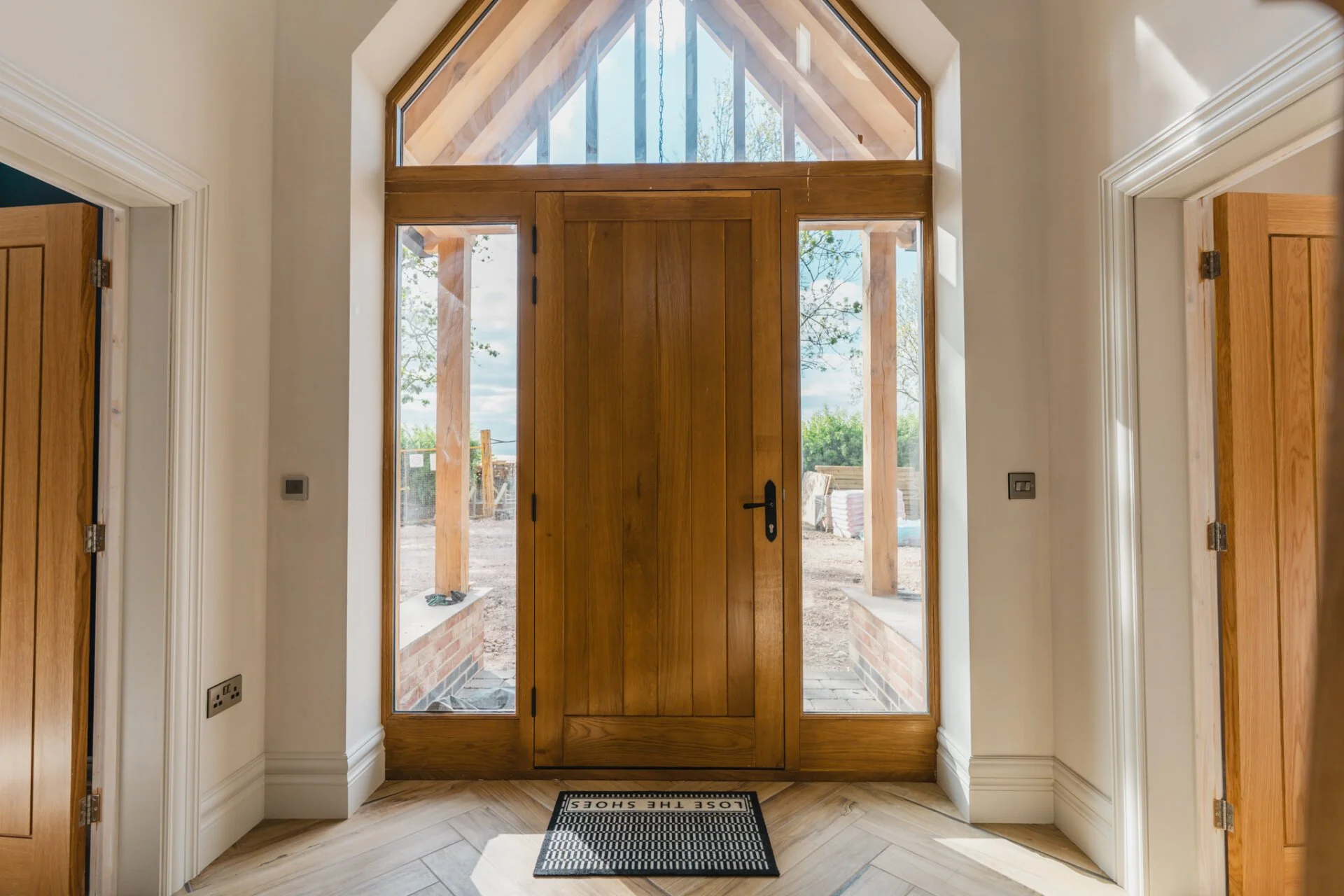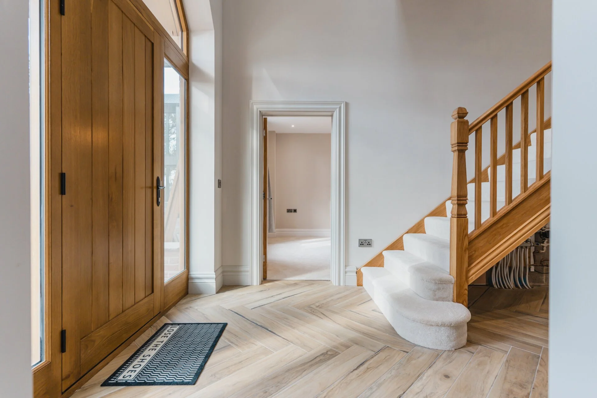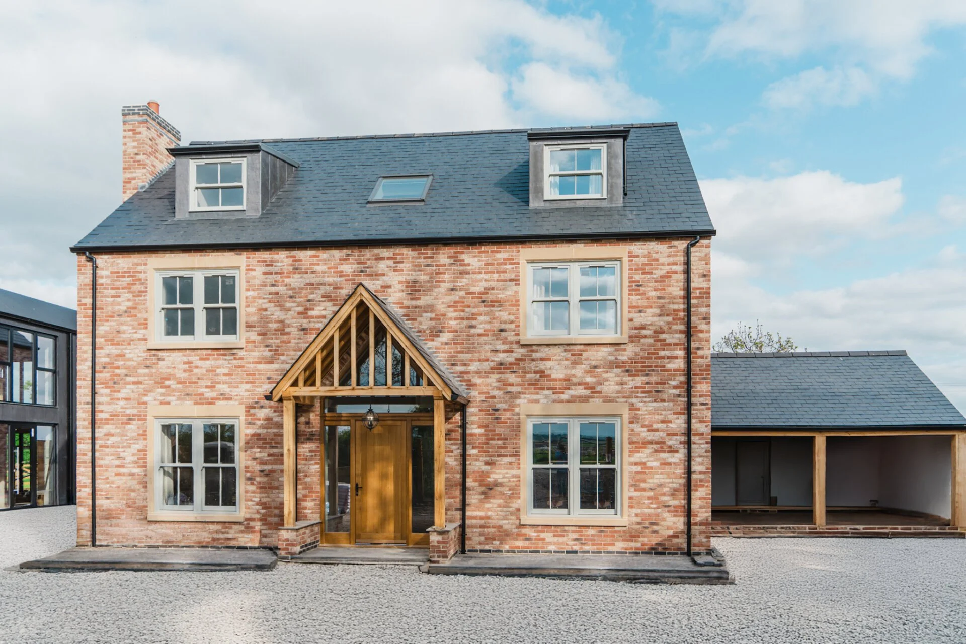 The property graciously unfolds with a generous entrance hall showcasing full triple height ceilings, leading to the living room, study, and the heart of the home, the open-plan kitchen. The living room exudes warmth and character with a striking exposed brick fireplace and solid oak mantle, creating a cosy retreat. The ground floor also features a versatile space currently used as a study but can easily be transformed into a playroom, snug, or additional bedroom. The first floor is home to the master bedroom, a sanctuary of tranquillity, with bi-fold doors opening to a Juliet balcony, overlooking the picturesque countryside, a large walk-in wardrobe area, and a luxurious en-suite bathroom with a four-piece suite. Completing the first floor are a further two double bedrooms and family bathroom. The second floor offers two additional double bedrooms with en-suites, all designed by Vanity Hall, ensuring comfort and convenience for all residents.